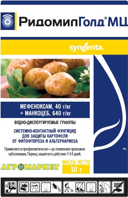 Фунгицид Ридомил голд ВДГ АГРОМАРКЕТ 50 г - это системно-контактный фунгицид, предназначенный для защиты картофеля от комплекса болезней, обладающий защитным, лечебным, антиспоролирующим и искореняющим действием, обеспечивающий полную защиту растений изнутри и снаружи.
