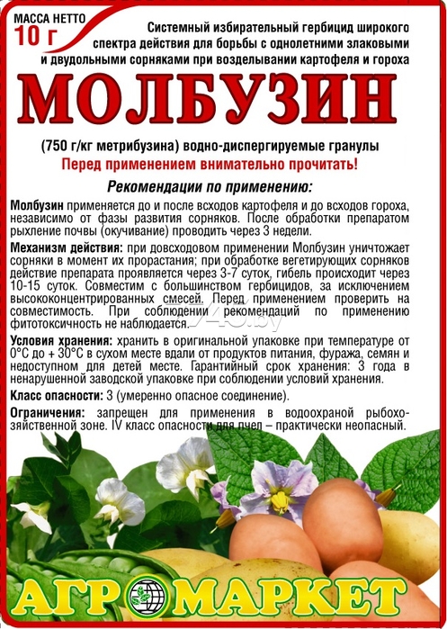 Гербицид Молбузин АГРОМАРКЕТ 10 г (16697) - это системный изберательный гербицид широкого спектра действия. Предназначен для борьбы с однолетними злаковыми и двудольными сорняками при возделывании картофеля и гороха. Применяется до и после всходов картофеля и до всходов гороха, независимо от фазы развития сорняков. После обработки препаратом рыхление почвы (окучивание) проводить через 3 недели.