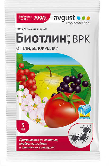 Инсектицид Биотлин ВРК AVGUST 9 мл – системный препарат для уничтожения различных видов тли на плодовых, ягодных, овощных и цветочных культурах. Позволяет предотвратить развитие новых поколений вредителей. Эффективен против насекомых, скрытоживущих и питающихся на нижней стороне листа. Обладает высокой скоростью воздействия – эффект от обработки наблюдается уже через несколько часов. Не вызывает привыкания у насекомых.