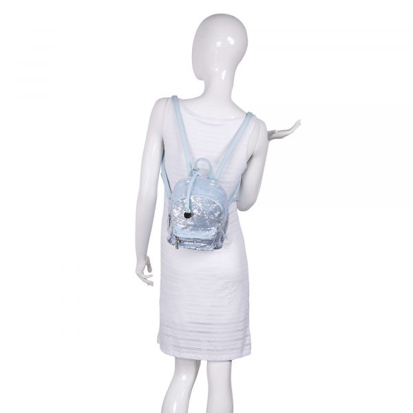 Миниатюрный, изысканный рюкзак POLA декорирован мелкими пайетками, что создаёт эффект зеркальной, переливающейся поверхности. Ручка, лямки и задняя стенка рюкзака выполнены из экокожи. Модель закрывается на металлическую молнию, внутри основного отделения есть кармашек на молнии и открытый карман, спереди рюкзака также есть накладной карман на молнии. С помощью данного аксессуара возможно создать неповторимый, вечерний образ.