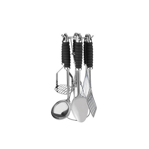 • Особенности Набор кухонных принадлежностей из 7 предметов: половник; лопатка; ложка для спагетти; поварская ложка; поварская вилка; картофелемялка; подставка.