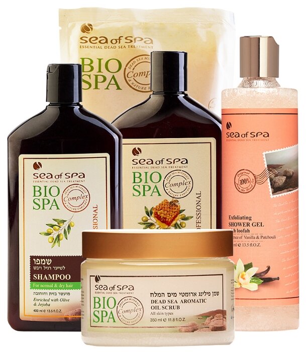 - В наборе шампунь для нормальный волос 400мл., кондиционер для нормальных и сухих волос 400мл., гель для душа 400мл., скраб для тела Ваниль 350 мл., натуральная минеральная соль 500 гр