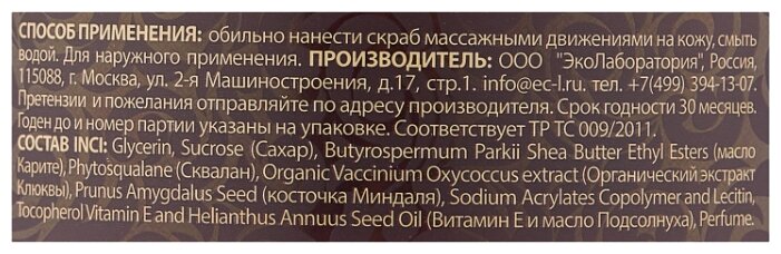 - Состав glycerin, sucrose (сахар), butyrospermum parkii shea butter ethyl esters (масло карите), phytosqualane (сквалан), organic vaccinium oxycoccus extract (органический экстракт клюквы), prunus amygdalus seed (косточка миндаля), sodium acrylates copolymer and lecitin, tocopherol vitamin e and helianthus annuus seed oil (витамин е и масло подсолнуха), perfume