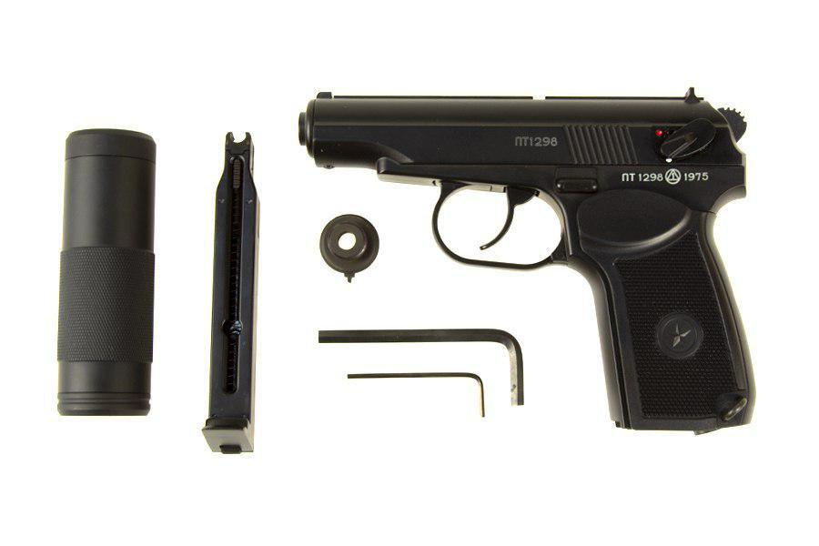 - Комплектация Комплектация: пистолет, инструкция, магазин, переходник для глушителя, глушитель, шомпол, 2 шестигранника.
