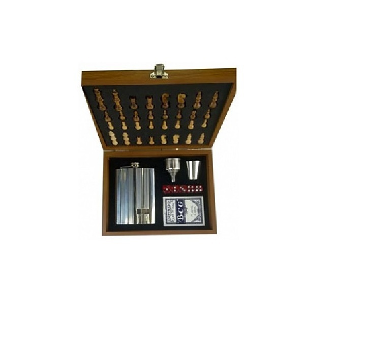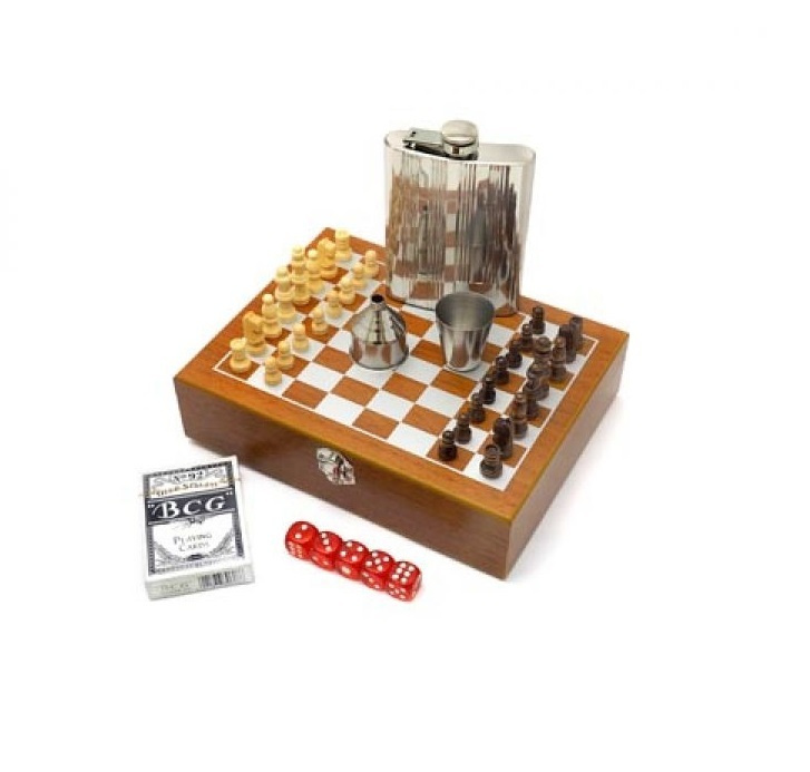 - Комплектация Фляга, стопка, воронка, шахматы, игральные карты, кости