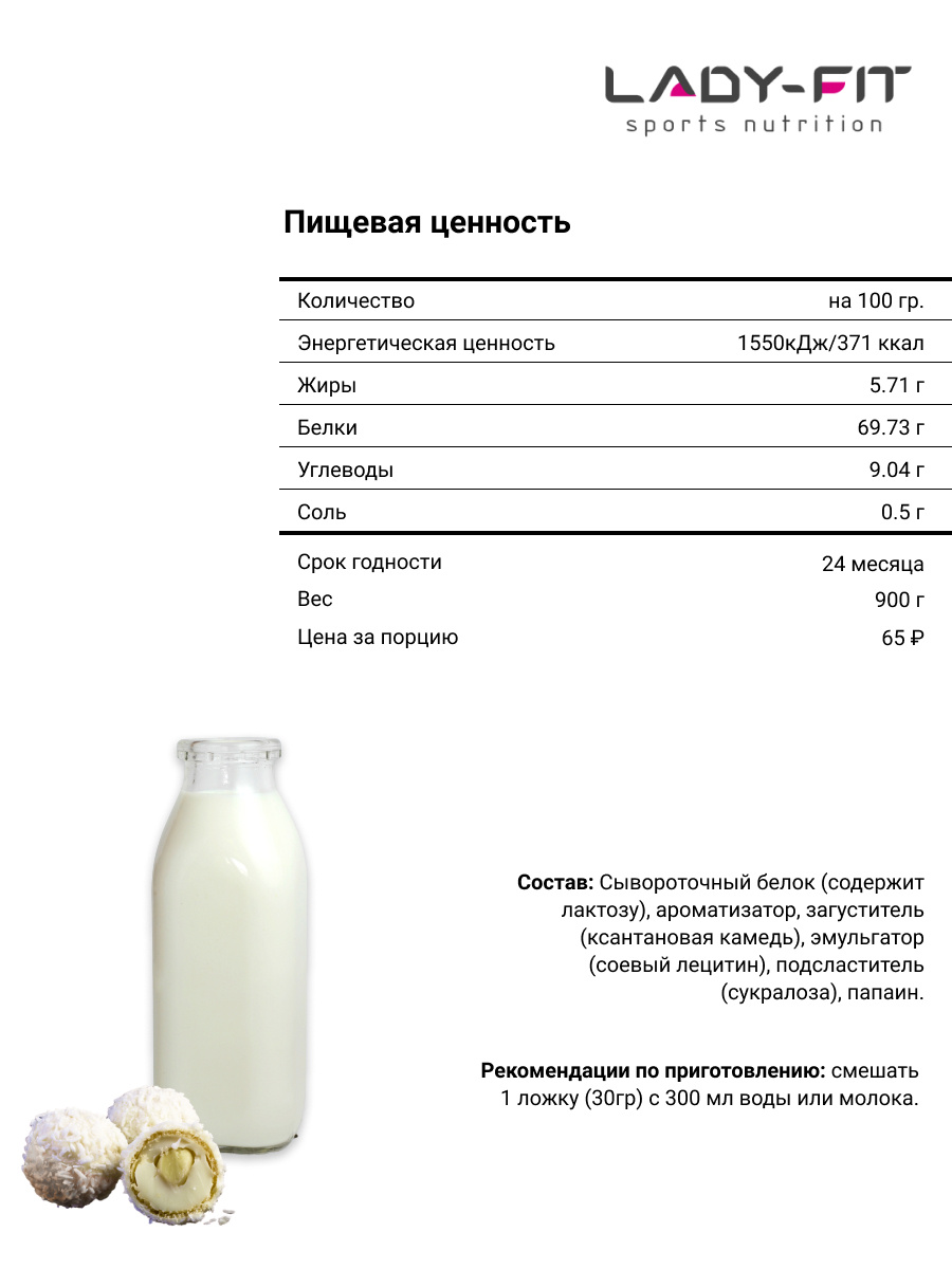 • Состав: Сывороточный белок (содержит лактозу), загуститель (ксантановая камедь), эмульгатор (соевый лецитин), ароматизатор, подсластитель (сукралоза), папаин. Не содержит ГМО.