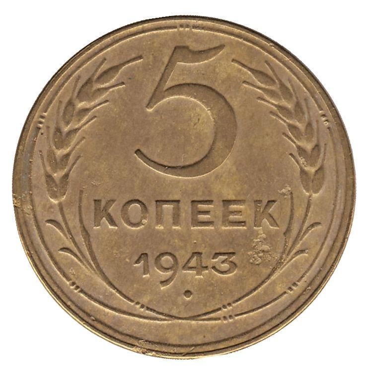 Монета номиналом 5 копеек. СССР, 1943 год.