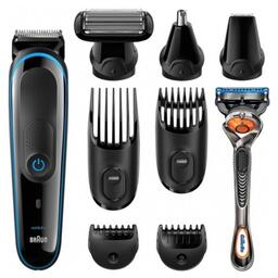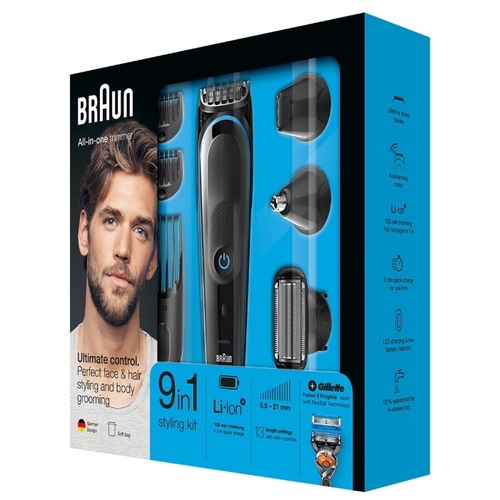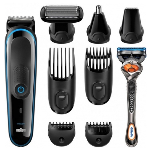Дополнительная информациящеточка для чистки; гребень для короткой бороды 3-11 мм с шагом в 2 мм; гребень для длинной бороды 13-21мм с шагом в 2 мм; гребни 1мм и 2мм; насадка для стайлинга тела; насадка для точного стайлинга; насадка для носа и ушей; бритва Gillette Fusion5 ProGlide с технологией Flexball