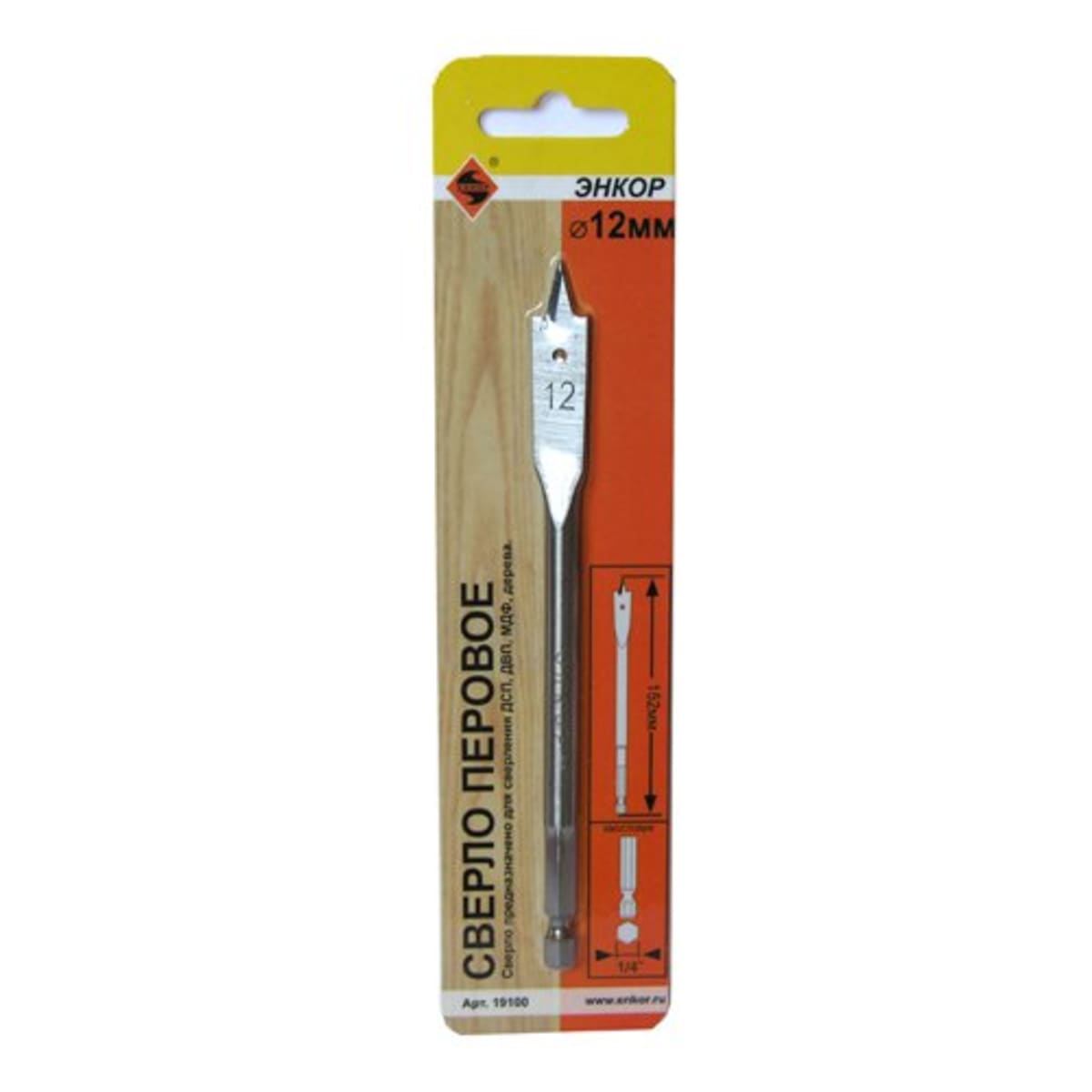 Сверло по дереву Энкор 19100, 12 мм, перовое с длиной 152 мм