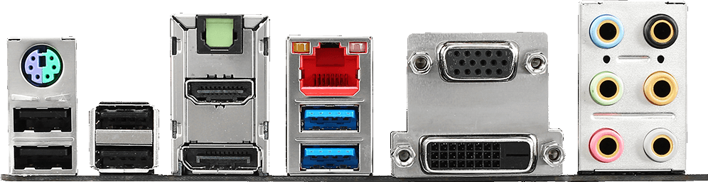 - Разъёмы на задней панели PS/2, 4 x USB 2.0, 2 x USB 3.0, VGA (D-Sub), DVI, HDMI, DisplayPort, RJ-45, S/PDIF (оптический)
