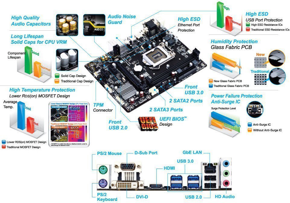 • Разъёмы на задней панели 2 x PS/2, 2 x USB 2.0, 4 x USB 3.0, VGA (D-Sub), DVI, HDMI, RJ-45