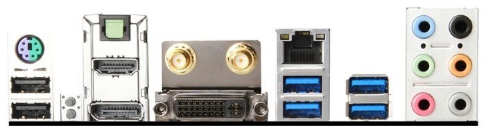 - Разъёмы на задней панели PS/2, 2 x USB 2.0, 4 x USB 3.0, DVI, HDMI, DisplayPort, RJ-45, S/PDIF (оптический)