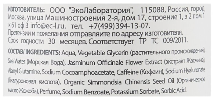 - Состав aqua, glycerin, sea water (морская вода), jasminum extract (экстракт жасмина), alanyl glutamine, sodium cocoamphoacetate, caffeine (кофеин), hyaluronic acid (гиалуроновая кислота), organic simmondsia chinensis oil (органическое масло жожоба), perfume, sodium benzoate, potassium sorbate, sorbic acid