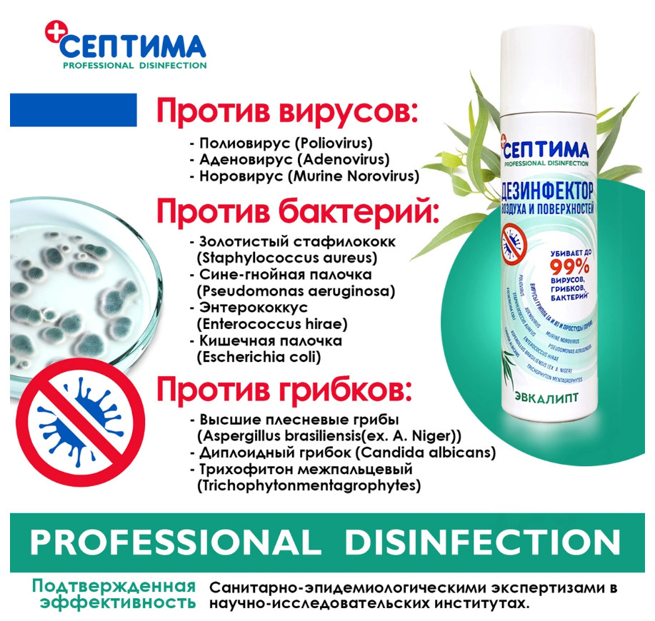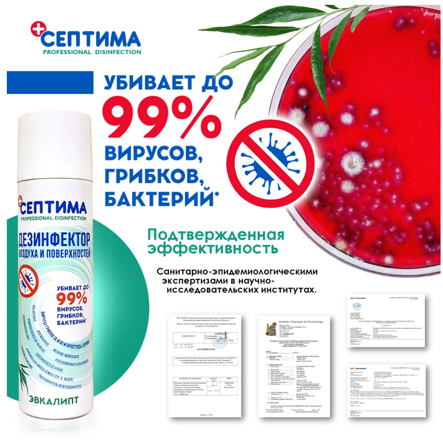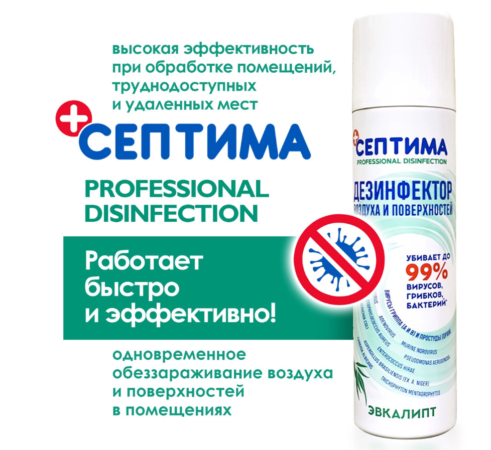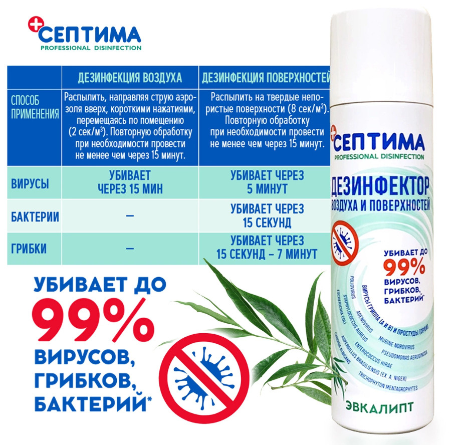 Способ примененияДезинфекция воздуха: Распылить, направляя струю аэрозоля вверх, короткими нажатиями, перемещаясь по помещению (2сек/м3). Повторную обработку при необходимости провести не менее чем через 15 минут. Убивает вирусы через 15 минут. Дезинфекция поверхностей: Распылить на твердые непористые поверхности (8сек/м2). Повторную обработку при необходимости провести не менее через 15 минут. Вирусы убивает через 5 минут; бактерии убивает через 15 секунд; грибки убивает через 15 секунд-7 минут. Возможно использовать в присутствии людей при обработке небольших помещений. В качестве профилактики использовать влажную уборку и проветривание помещений сквозным потоком воздуха.