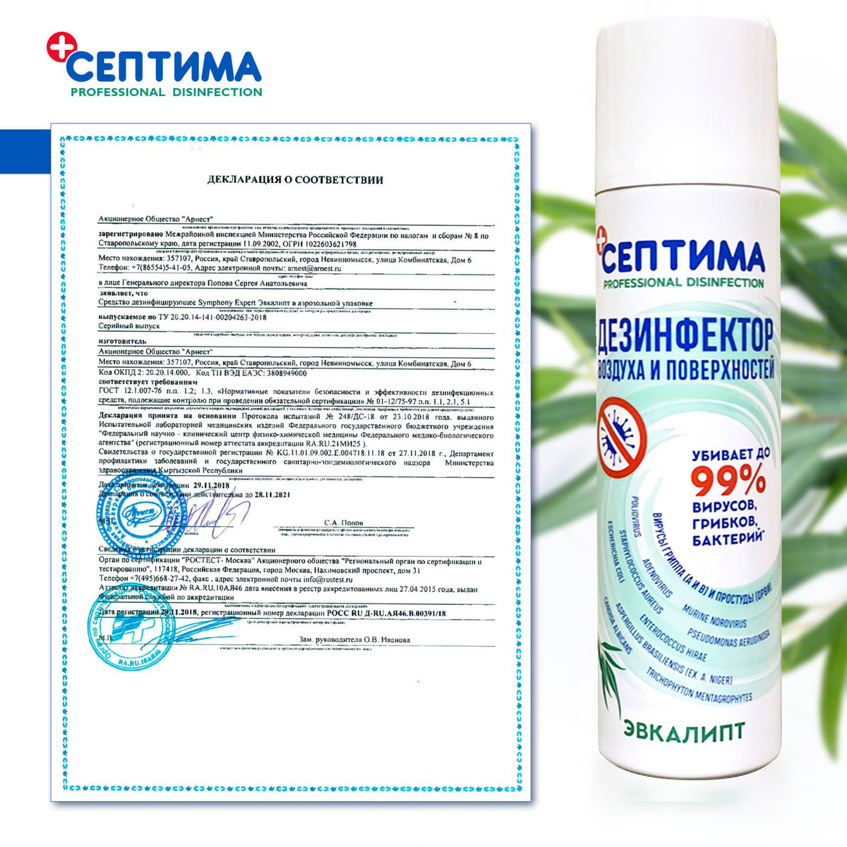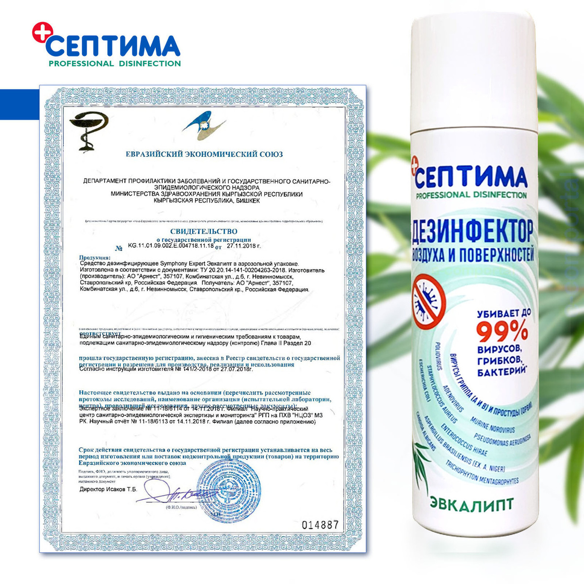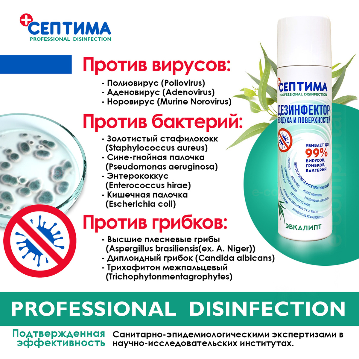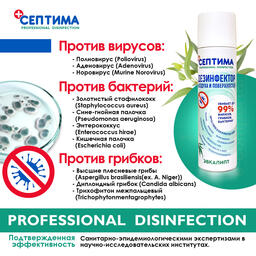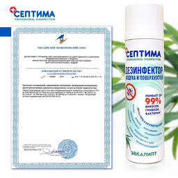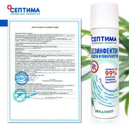 Способ примененияДезинфекция воздуха: Распылить, направляя струю аэрозоля вверх, короткими нажатиями, перемещаясь по помещению (2сек/м3). Повторную обработку при необходимости провести не менее чем через 15 минут. Убивает вирусы через 15 минут. Дезинфекция поверхностей: Распылить на твердые непористые поверхности (8сек/м2). Повторную обработку при необходимости провести не менее через 15 минут. Вирусы убивает через 5 минут; бактерии убивает через 15 секунд; грибки убивает через 15 секунд-7 минут. Возможно использовать в присутствии людей при обработке небольших помещений. В качестве профилактики использовать влажную уборку и проветривание помещений сквозным потоком воздуха.