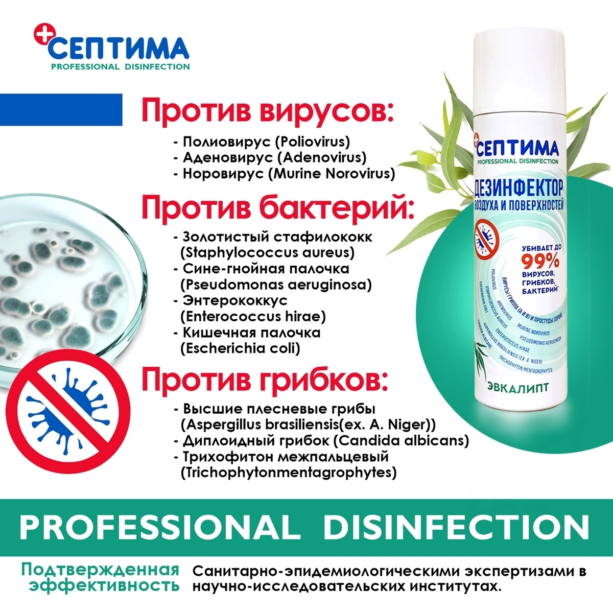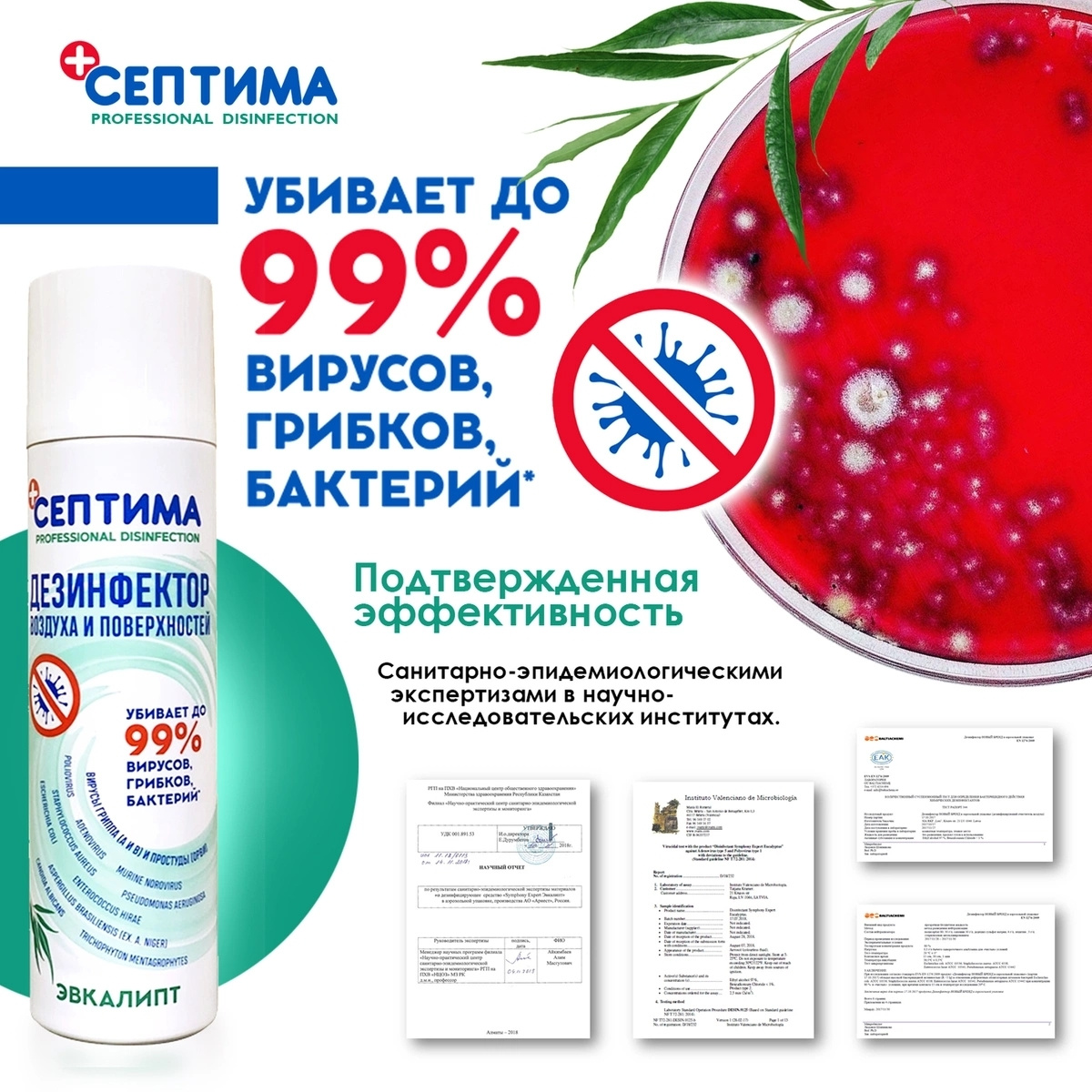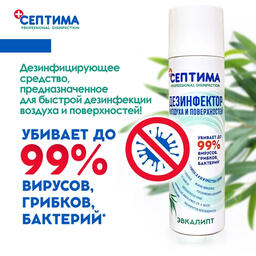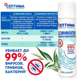 Способ примененияДезинфекция воздуха: Распылить, направляя струю аэрозоля вверх, короткими нажатиями, перемещаясь по помещению (2сек/м3). Повторную обработку при необходимости провести не менее чем через 15 минут. Убивает вирусы через 15 минут.