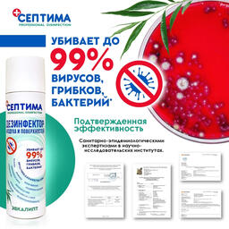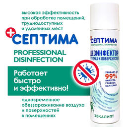 Дезинфекция поверхностей: Распылить на твердые непористые поверхности (8сек/м2). Повторную обработку при необходимости провести не менее через 15 минут. Вирусы убивает через 5 минут; бактерии убивает через 15 секунд; грибки убивает через 15 секунд-7 минут. Возможно использовать в присутствии людей при обработке небольших помещений.
