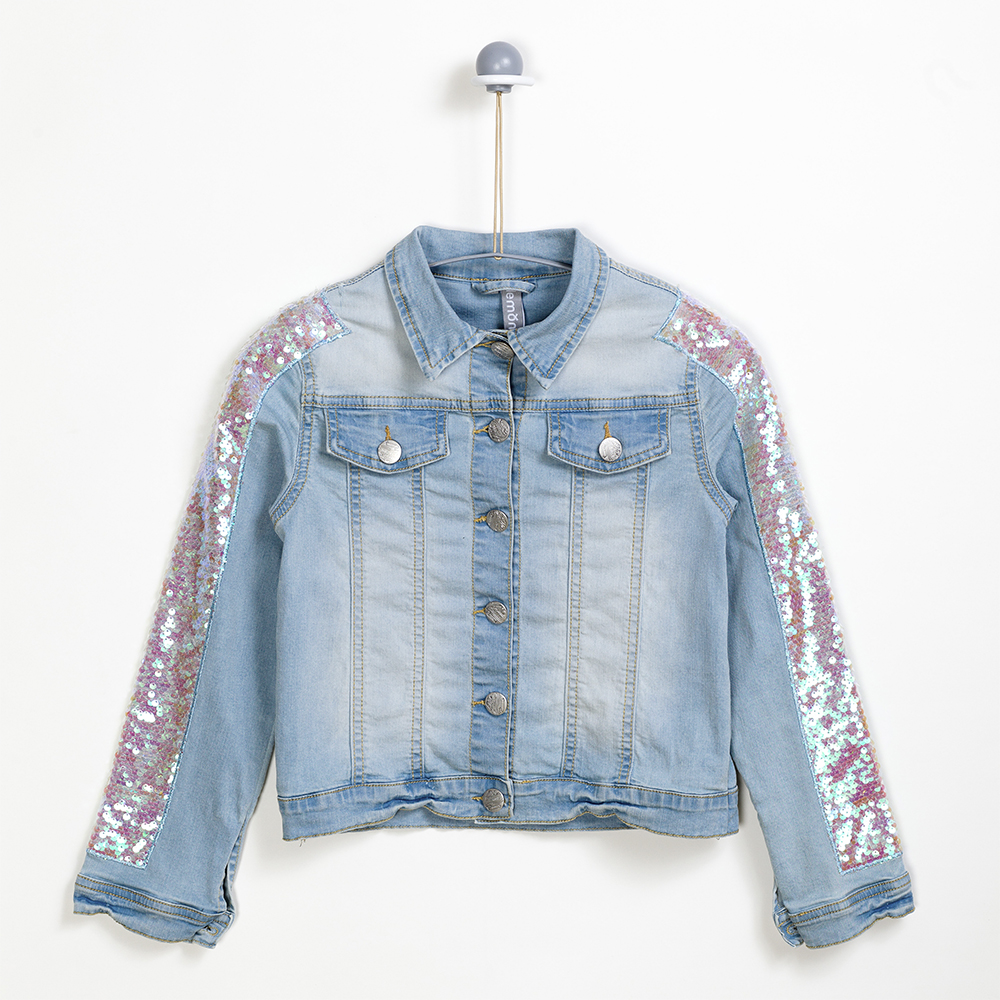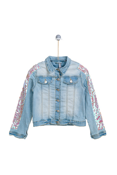 Стильная джинсовая куртка с блестящими розовыми пайетками на рукавах и декоративными потертостями. Застегивается на удобные металлические пуговицы.