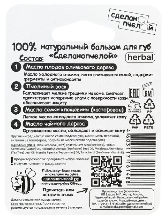 - Состав пчелиный воск, масло плодов оливкового дерева, масло семян подсолнуха, масло листьев и стеблей мелиссы лимонной, масло чайного дерева, масло семян клещевины обыкновенной (касторовое масло)