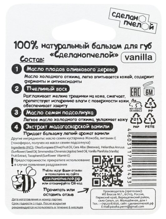 - Состав пчелиный воск, масло плодов оливкового дерева, масло семян подсолнуха,экстракт ванили