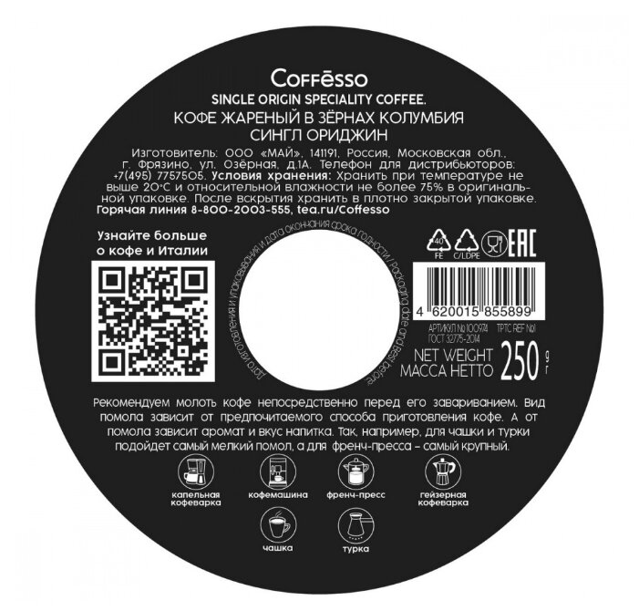 Кофе в зернах Coffesso Colombia Single Origin Speciality