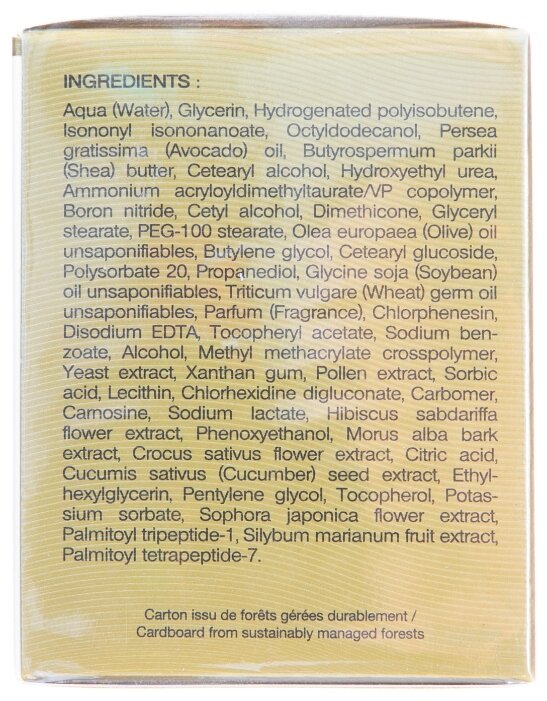 - Состав aqua (water), glycerin, hydrogenated polyisobutene, isononyl isononanoate, octyldodecanol, persea gratissima (avocado) oil, butyrospermum parki (shea) butter, cetearyl alcohol, hydroxyethyl urea, ammonium acryloyldimethyltaurate/vp copolymer, boron nitride, cetyl alcohol, dimethicone, glyceryl stearate, peg-100 stearate, olea europaea (olive) oil unsaponifiables, butylene glycol, cetearyl glucoside, polysorbate 20, propanediol, glycine soja (soybean) oil unsaponifiables, triticum vulgare (wheat) germ oil unsaponifiables, parfum (fragrance), chlorphenesin, disodium edta, tocopheryl acetate, sodium benzoate, alcohol, methyl methacrylate crosspolymer, yeast extract, xanthan gum, pollen extract, sorbic acid, lecithin, chlorhexidine digluconate, carbomer, carnosine, sodium lactate, hibiscus sabdariffa flower extract, phenoxyethanol, morus alba bark extract, crocus sativus flower extract, citric acid, cucumis sativus (cucumber) seed extract, ethylhexylglycerin, pentylene glycol, tocopherol, potassium sorbate, sophora japonica flower extract, palmitoyl tripeptide-1, silybum marianum fruit extract, palmitoyl tetrapeptide-7