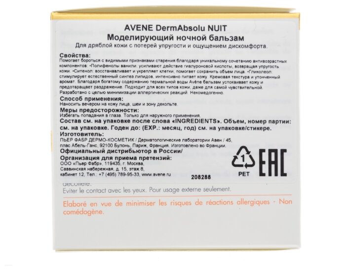 • Состав avene thermal spring water (avene aqua), caprylic/capric triglyceride, coco-caprylate/caprate, glycerin, butyrospermum parkii (shea) butter (butyrospermum parkii butter), methyl gluceth-20, dimethicone, behenyl alcohol, octyldodecanol, cetearyl alcohol, glyceryl stearate, peg-100 stearate, glyceryl linoleate, aluminum starch octenylsuccinate, ammonium acryloyldimethyltaurate/vp copolymer, bakuchiol, simmondsia chinensis (jojoba) seed oil (simmondsia chinensis seed oil), benzoic acid, caprylyl glycol, cetearyl glucoside, dimethicone crosspolymer, disodium edta, fragrance (parfum), glyceryl linolenate, glyceryl oleate, glyceryl palmitate, glycine soja (soybean) oil (glycine soja oil), helianthus annuus (sunflower) seed oil (helianthus annuus seed oil), hydrogenated starch hydrolysate, propylene glycol, sodium hydroxide, tocopherol, tocopheryl glucoside, vanilla tahitensis fruit extract, water (aqua)