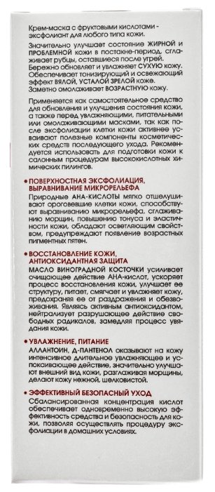 - Активный ингредиент гликолевая кислота, молочная кислота, фруктовые кислоты, пантенол
