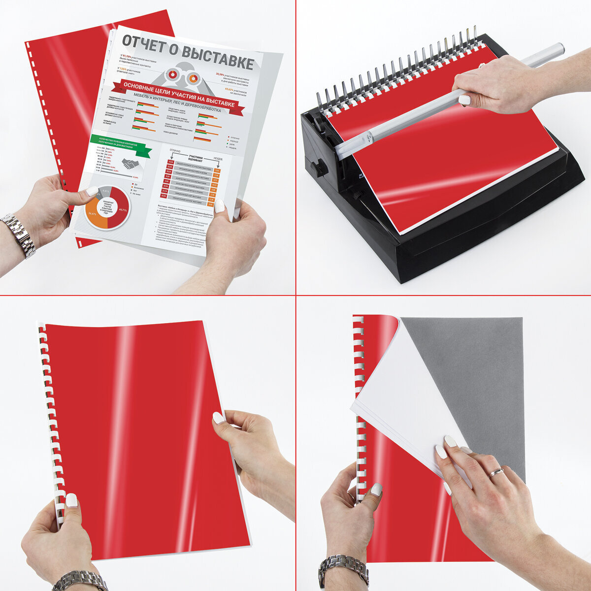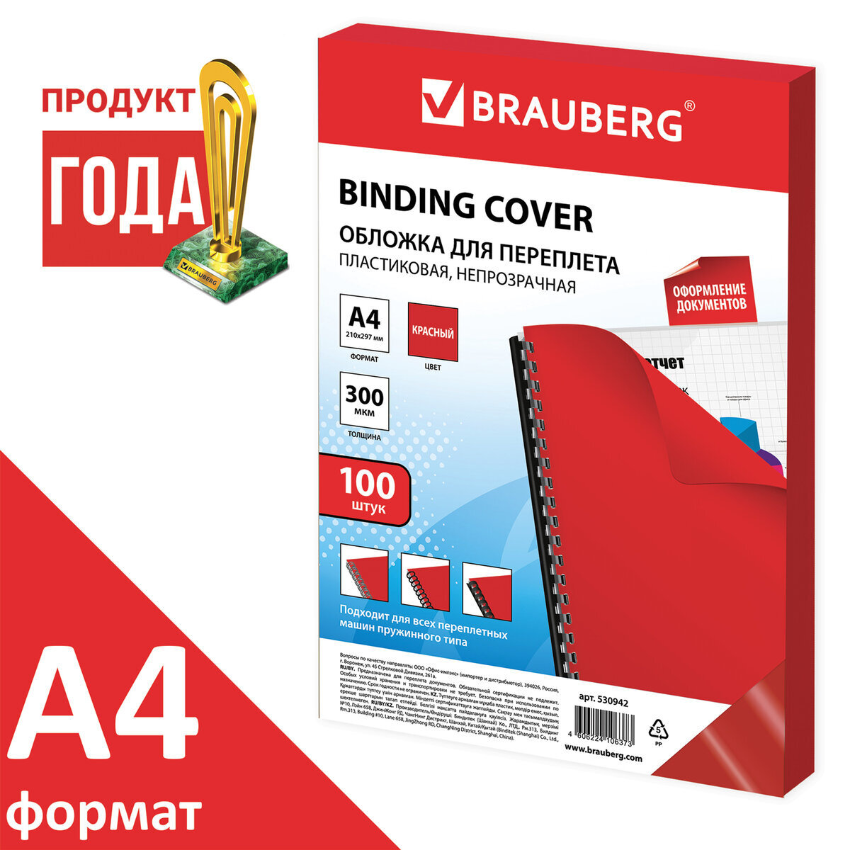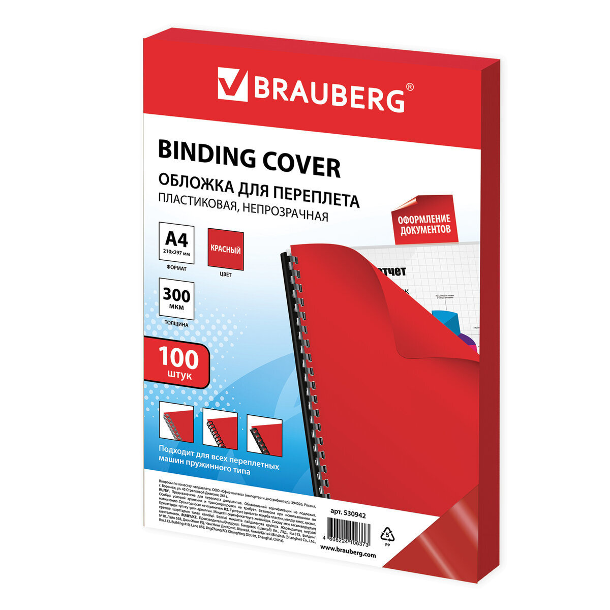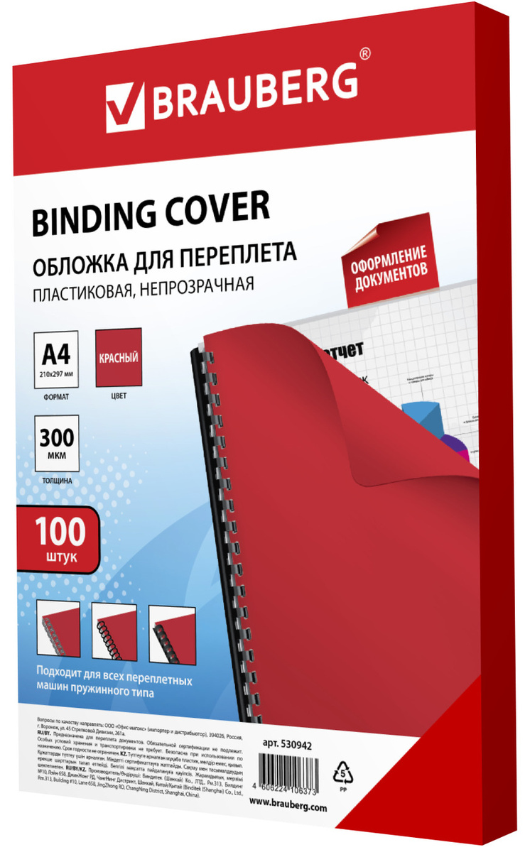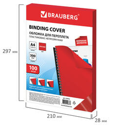 Обложки для переплета Brauberg, комплект 100 штук, А4, пластик 300 мкм, красные