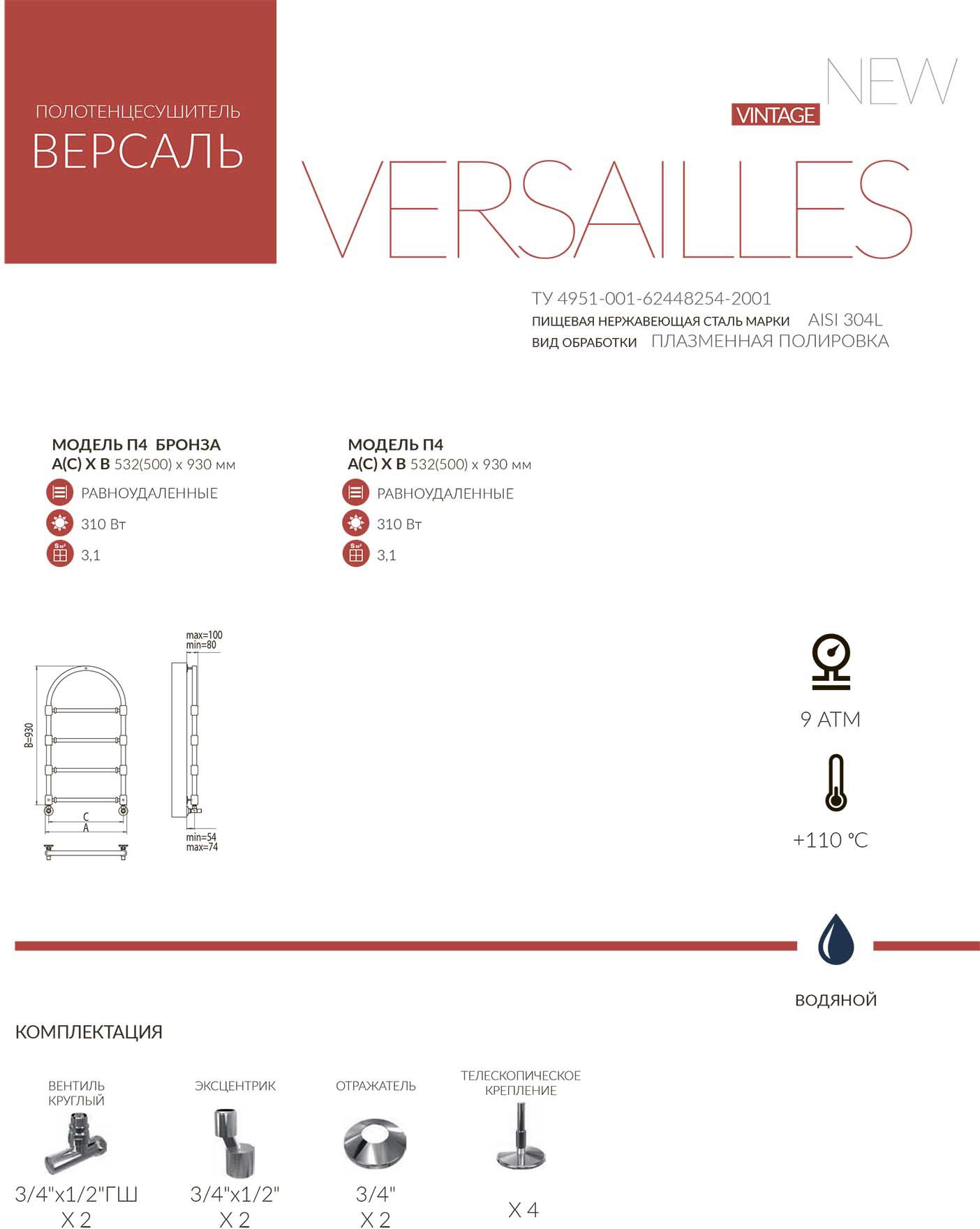 Полотенцесушитель водяной Teminus Версаль П4 540x930