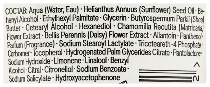 - Cостав aqua (water, eau), helianthus annuus (sunflower) seed oil, behenyl alcohol, ethylhexyl palmitate, glycerin, butyrospermum parki (shea) butter, cetearyl alcohol, hexanediol, chamomilla recutita (matricaria) flower extract, bellis perennis (daisy) flower extract, allantoin, panthend, parfum (fragrance), sodium stearoyl lactylate, triceteareth-4 phosphate, carbomer, tocopherol, hydrogenated palm glycerides citrate, pantolactone, sodium hydroxide, limonene, linalool, benzyl alcohol, citral, citronellol, sodium benzoate, sodium salicylate, hydroxyacetophenone