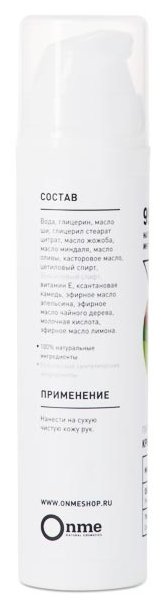 - Cостав вода, глицерин, масло ши, глицерил стеарат цитрат, масло жожоба, масло миндаля, масло оливы, касторовое масло, цетиловый спирт, бензиловый спирт, витамин Е, ксантановая камедь, эфирное масло апельсина, эфирное масло чайного дерева, молочная кислота, эфирное масло лимона