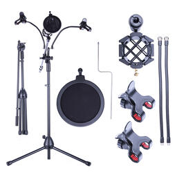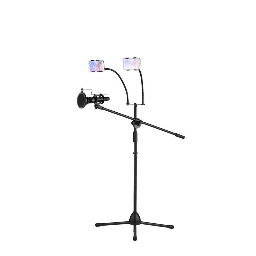 - Комплектация Напольная складная стойка, антивибрационный монтаж, защита от ветра с держателем, два держателя телефонов с гибкими трубками.