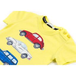Футболка прямого покрою, з короткими рукавами і круглою горловиною. Прикрашена спереду об'ємним принтом різнокольорових машин і контрастним написом «Down the Road». Горловина оброблена м'якою подвійною трикотажною резинкою. На лівому плечі застібка на фірмові, перламутрові ґудзики, яка полегшить процес одягання (для розмірів 80, 86, 92, 98).