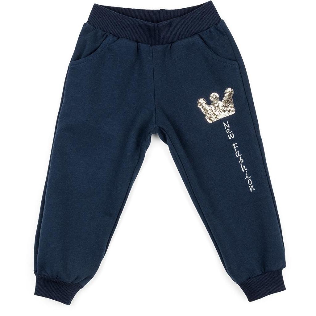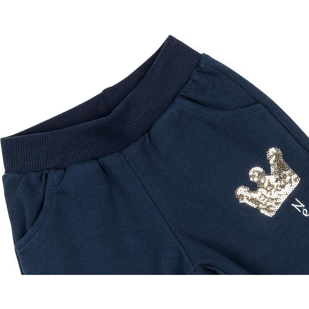 Зручні штанці з двома прорізними кишенями так само прикрашені коронкою з золотих паєток. Еластичний пояс з подвійної трикотажної «гумки», посилений вставленою всередину щільною «гумкою», і манжети по низу штанців, забезпечать оптимальну посадку по фігурі. Елементи комплекту відмінно виглядають разом, але будуть чудово виглядати і по-окремо, надаючи безліч варіантів для створення найрізноманітніших образів для Вашої улюбленої юної модниці.