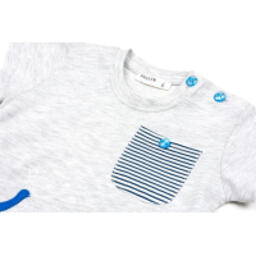 Футболка прямого крою, з коротким рукавом і круглою горловиною. Прикрашена смугастою функціональною кишенькою і об'ємної аплікацією симпатичного слоника, з елементами вишивки. Горловина оброблена м'якою подвійною трикотажною резинкою. На лівому плечі застібка на фірмові, перламутрові ґудзики, яка полегшить процес одягання (для розмірів 80, 86).