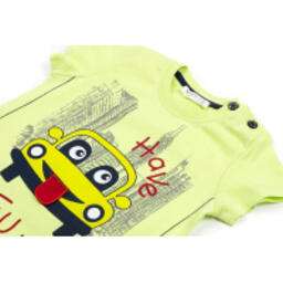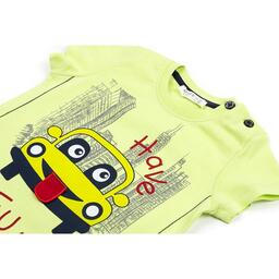 Футболка прямого крою, з короткими рукавами і круглою горловиною. Прикрашена спереду об'ємним принтом веселого, симпатичного автомобіля на тлі висоток мегаполісу і контрастним написом «HAVE FUN». Горловина оброблена м'якою подвійною трикотажною резинкою. На лівому плечі застібка на фірмові, перламутрові ґудзики, яка полегшить процес одягання (для розмірів 86, 92, 98).