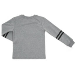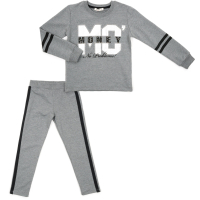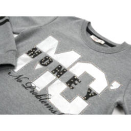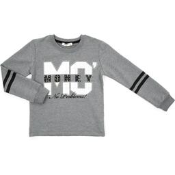 Затишний світшот прямого силуету прикрашений великими прінтованнимі буквами МС сріблястого кольору і прінтованнимі написами. Контури MC оформлені дрібними різнокольоровими переливчастими стразами. Зверху на слові MONEY додані сріблясті намистини. На рукавах - чорні горизонтальні принтовані лампаси. Кругла горловина і манжети рукавів оброблені подвійною якісною трикотажною «гумкою».