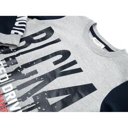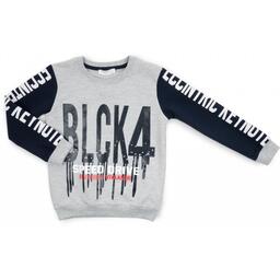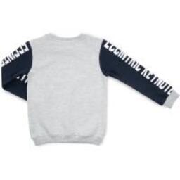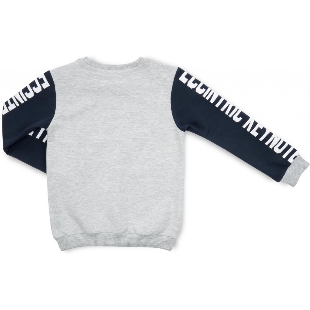 Затишний світшот прямого силуету, поличка і спинка приємного світло-сірого кольору, рукава темно-сині. Прикрашений стильним ефектним принтовим малюнком на поличці і класними принтовими написами на рукавах. Кругла горловина, манжети довгих рукавів та низ світшоту, оброблені подвійною якісною трикотажною «гумкою».