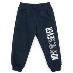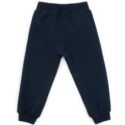 Затишні штани темно-синього кольору на манжетах, з двома прорізними кишенями, так само прикрашені ефектним контрастним принтом. Еластичний пояс і манжети, в подвійну трикотажну «гумку», забезпечать затишок і оптимальну посадку по фігурі. Пояс додатково посилений широкою вставленою «гумкою».