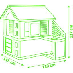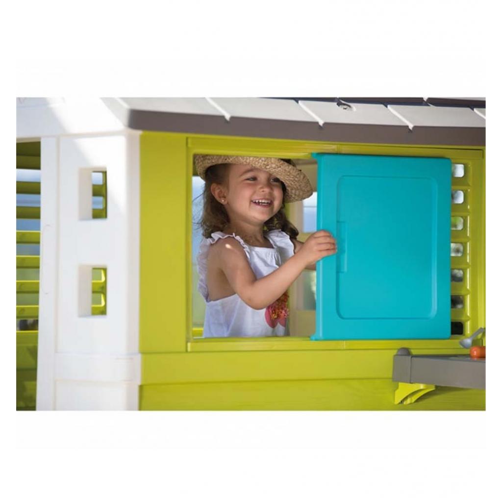 На ігровій кухні, яка кріпиться до зовнішньої стіни, є раковина з краном (без подачі води), плита для приготування їжі та підставка для посуду.