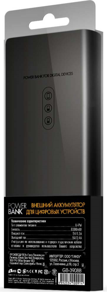 Внешний аккумулятор Ginzzu GB-3908B 8000 мАч, черный