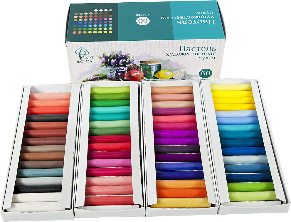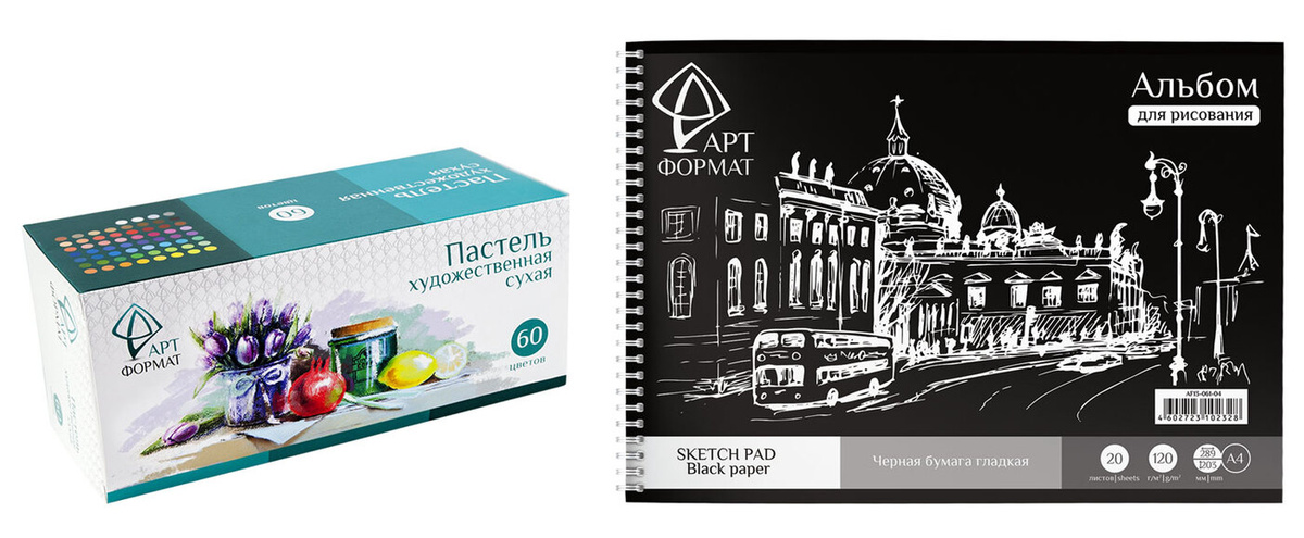 - Комплектация Пастель худ. АРТформат сухая 60 цв. - 1 штука. Альбом-планшет АРТформат А4, 20 листов черная бумага 120 г/м2 - 1 штука.