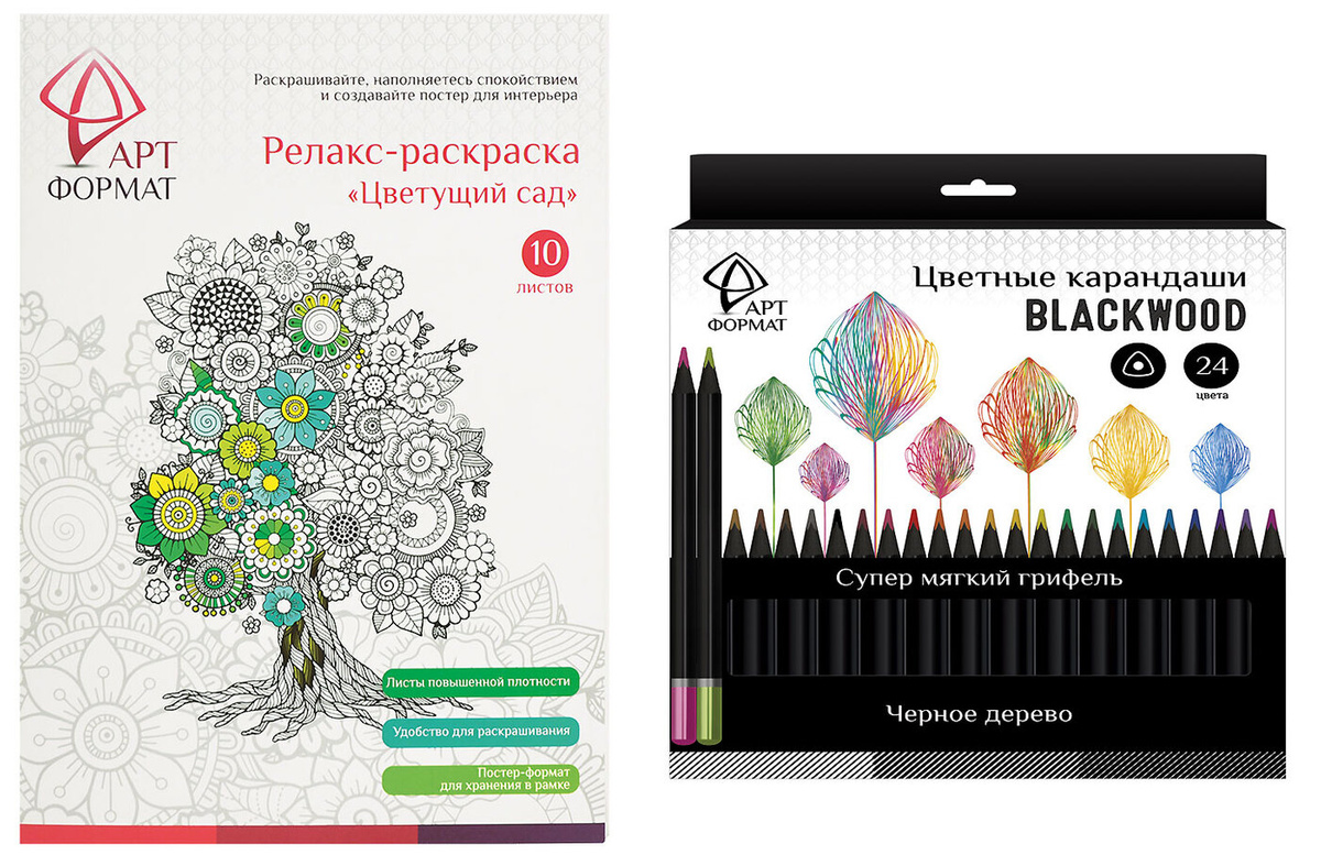- Комплектация Набор цветных карандашей АРТформат Blackwood 24 цвета черное дерево - 1 штука. Раскраска антистресс АРТформат ЦВЕТУЩИЙ САД 10 листов А4 - 1 штука.