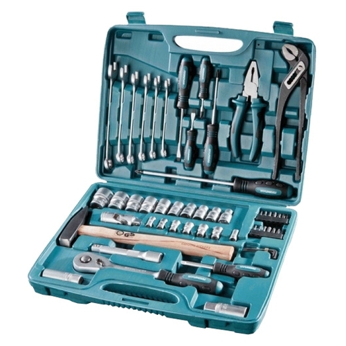 - Инструменты в комплекте молоток, отвёртки, рукоять для бит, трещотка, пассатижи, ключи гаечные, ключ переставной гаечный, ключи имбусовые (шестигранные)
