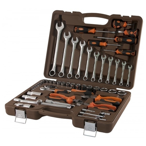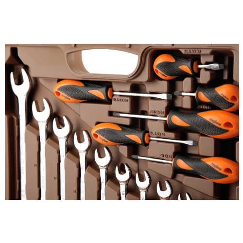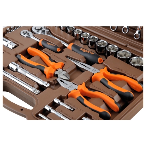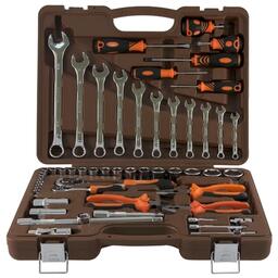 • Инструменты в комплекте отвёртки, вороток для головок, трещотка, пассатижи, ключи гаечные, кусачки