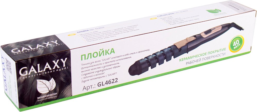 Плойка мощностью 40 Вт. Нагревательный элемент диаметром 20 мм. Кнопка включения с подсветкой. Спиральная направляющая. Керамическое покрытие рабочей поверхности. Клипса для фиксирования пряди. Шнур питания, вращающийся на 360°.