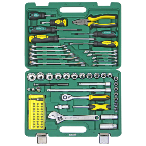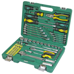 - Инструменты в комплекте отвёртки, рукоять для бит, трещотка, пассатижи, ключи гаечные, ключ разводной