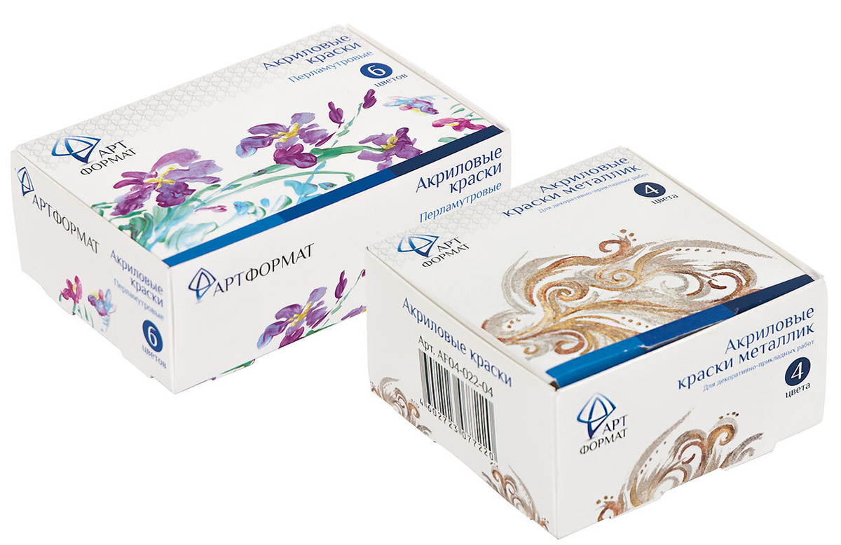 - Комплектация Краска акриловая ARTФормат МЕТАЛЛИК 4 цвета - 1 штука. Краска акриловая перламутровая ARTформат 6 цветов - 1 штука.
