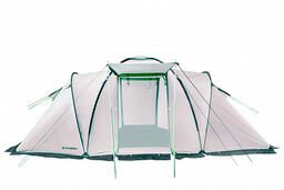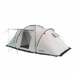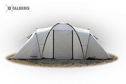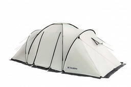 Популярная, большая кемпинговая палатка с одним тамбуром и двумя спальными отсеками Talberg Base 6 – отличный вариант для семьи или дружной компании, отдыхающей на природе. Благодаря цвету тента, палатка отражает солнечные лучи и меньше нагревается изнутри. Простая и понятная конструкция, Вы можете установить палатку буквально в течение 10-15 минут. Рассчитанная на шестерых человек палатка, имеет идеальное соотношение объем-вес и удобную сумку для переноски. Внешний тент надежно защищает от сильного ветра и атмосферных осадков. Тамбур площадью около 5 м/2 имеет съемный пол из армированного полиэтилена. Размер тамбура позволяет разместить все необходимое снаряжение, а так же набор кемпинговой мебели, для комфортного времяпрепровождения. По необходимости размер тамбура можно увеличить до 8,5 м/2, просто сняв одно боковое спальное место и оставив одно спальное место на двоих человек. Входы в тамбур продублированы москитной сеткой, которая надежно защищает от насекомых. Одну из дверей центрального входа можно использовать, как солнцезащитный козырек, установив его на стальных стойках (идут в комплекте). Юбку из армированного полиэтилена, можно быстро подвернуть, благодаря специальным затяжкам. Двухслойная конструкция палатки отлично испаряет конденсат и способствует комфортному проживанию в походных условиях. Модель рекомендуется для использования в сезон весна-лето-осень в солнечных регионах.